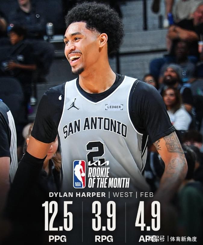 至于最佳新秀,哈珀单月场均贡献12.5分、3.9个篮板以及4.9次助攻。乍一看,这数据似乎平平无奇,与东部同获此殊荣的克努佩尔相比,更是略显逊色。克场均能轰下21.5命中4.5记三分,三分命中率高达48.5%。然而,无奈西部新秀中表现突出者寥寥,且马刺队的战绩太过耀眼,这才让哈珀脱颖而出。